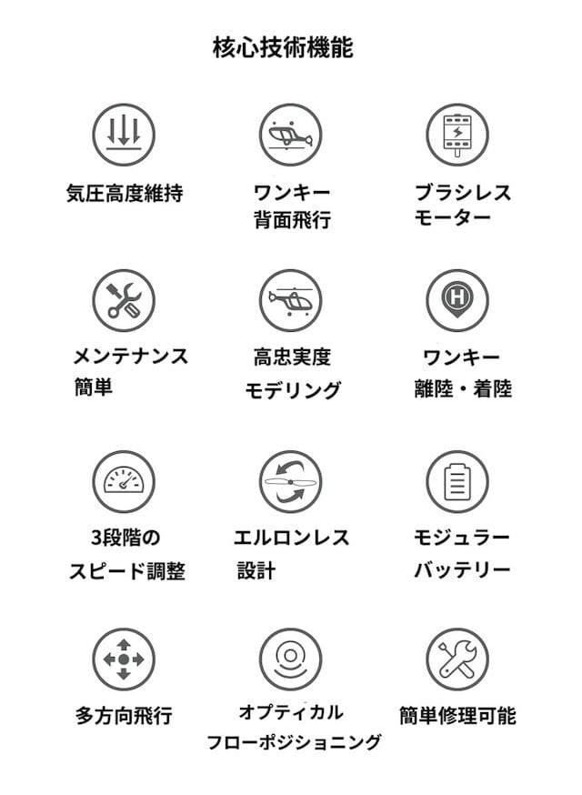 ・上昇、下降、前進飛行、後進飛行、左側飛行、右側飛行、左回転、右回転、ウェイポイント飛行、反転、ワンキー3D飛行など、様々な操縦が可能