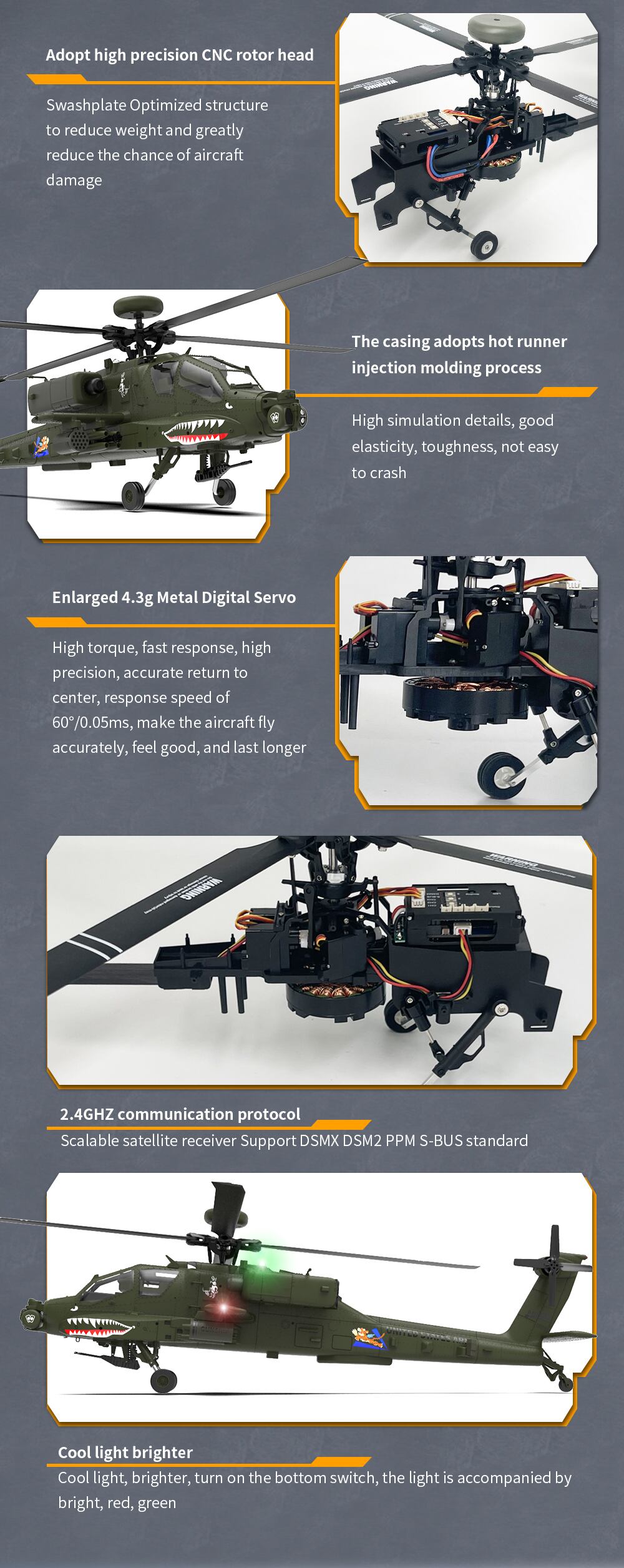 1.米国ボーイング AH-64 アパッチ ヘリコプターから 1:32 の比率でスケールダウンされ、忠実度の高いディテール、クールな照明、衝撃吸収着陸装置が特徴です。