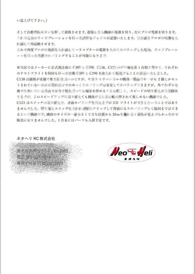 《注意》この機体は着陸する方法としてワンタッチスイッチ操作でもスムーズにきれいな着陸をいたしますが、地面に着地した時点ですぐにモーターの回転が止まりませんので、数秒間メインブレードは回転し続けています。モーターの回転をすぐに停止する方法は着地後すぐにプロポ右上隅の「STOP」ボタンを押せばすぐにモーターが停止します。